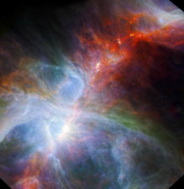 美国宇航局斯皮策红外空间望远镜而和欧洲航天局的赫歇尔空间望远镜联合拍摄到猎户座星云的“彩虹”图像,红外波段揭开了星云中隐藏的气体和未完全形成的恒星。