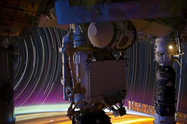 本图显示了宇航员在国际空间站上所拍摄的夜空照片,国际空间站大约距离地球表面240英里的轨道上,图中还可以看到俄罗斯的宇宙飞船和国际空间站处于对接状态,来自远征31机组的宇航员通过10分钟至15分钟的曝光拍摄到地球夜空的美丽景象。