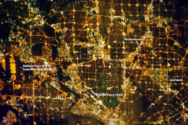 美国西部的大都市区的街道大都呈网格状分布,达拉斯都会区也是如此。这幅照片是国际空间站上的宇航员于2012年11月15日拍摄的,显示了得克萨斯州北部达拉斯都会区璀璨的城市灯火。