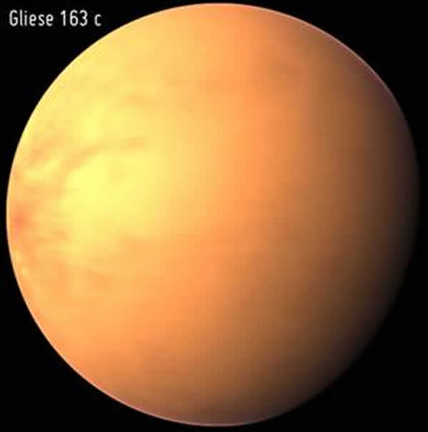 Gliese 163c,也位于恒星的宜居地带,尽管它位于所在恒星系统边缘。像HD 40307g一样,它的质量也大约是地球的7倍,可能是一颗体积较大的岩石行星或者较小的气态巨行星。这颗行星环绕一颗略比太阳昏暗的红矮星运行,公转周期为26天。由于它的构成成份,Gliese 163c拥有海洋和密集的大气层,但是这颗行星过于炽热,很可能难以维持生命存在。