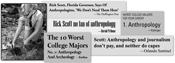 对人类学家来说,刚刚过去的2012年是艰难的一年。2011年的秋天,美国佛罗里达州州长Rich Scott公布,该州不再需要人类学家,支持人类学研究的那部分资金将用于教育科学。2012年1月,一项研究显示,人类学专业的大学毕业生有极高的失业率。8月和12月,两份高端的商业报告——来自于Kiplinger和 Forbes杂志——将人类学列为就业率和起薪最低的学科。