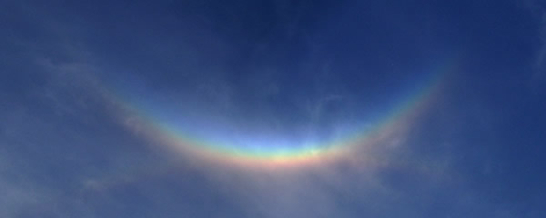 环天顶弧现象又被称为布拉维弧(Bravais arc),通常在太阳光穿过冰晶的时候形成,而冰晶是卷云的一部分。在环天顶弧的形成过程中,冰晶就相当于一个棱镜,将白光分离成各种各样不同波长的光谱。冰对于红光的折射率约为n=1.315,对于鲜紫光的折射率约为n=1.308,这就意味着环天顶弧的红色部分将会出现在天空相对较低处。
