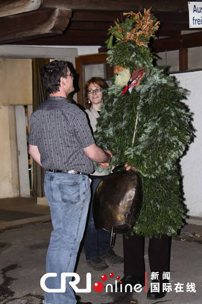 当“驱鬼小分队”来到某一处民居,他们首先围成一个圆圈,晃动身上佩戴的铃铛,巨大声响即使在屋内也听得一清二楚。房间里的人们听到铃铛声,就会纷纷走出家门,在家门口和这些无论“漂亮” 或是“丑陋”的人们一同唱起约德尔,互致新年祝福。按照当地传统,接受祝福的人可以送给表演者一些食品和饮料,感谢他们辛苦送福。于是就能看到不少女主人手拿葡萄酒瓶,一一送到表演者嘴边。有意思的是,酒瓶里一定插着一根吸管,因为穿着笨重服装和头饰的表演者的确不太方便再腾出一只手来喝饮料了。乌尔纳施的居民丽戈拉就非常欣喜地和全家人一起接受新年祝福。
