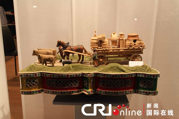 “这些装饰表现的是这里的人们的生活,人们一年的生活都展现在头饰上了。有些人在山上伐木,所以他们就在头饰上表现伐木的场景,有不少人从事畜牧业,他们就把奶牛(的形象)装饰在头上,有时候一个组里6个人的头饰一起表现一个主题。”