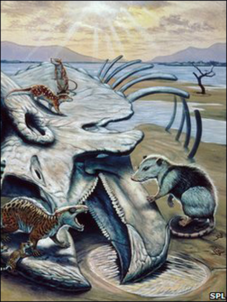 “举一个例子来说,如果爬行动物在中生代的时候没有占据与哺乳动物相对优越的状态,为什么哺乳动物只是在大型爬行动物在中生代末期那些大爬行动物绝迹之后才开始繁衍?”
