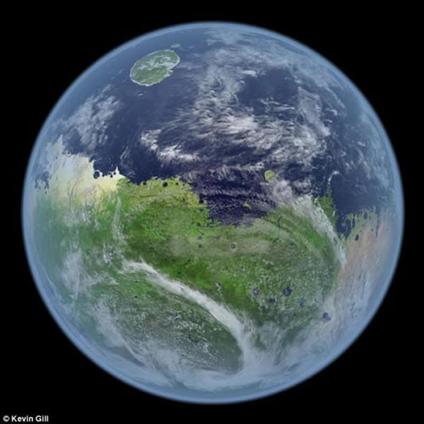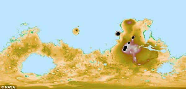 这些令人惊异的图像显示茂盛翠绿的火星拥有云层、绿洲和海洋。美国新罕布什尔州软件工程师凯文-吉尔说:“火星西半球图像在地平线上呈现出奥林帕斯山,远处是塔尔西斯火山,以及西半球中心是水手谷。”他使用美国宇航局地形勘测数据创建出这个火星3D模型结构。