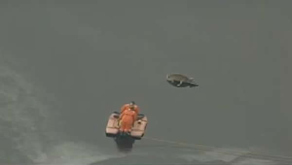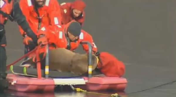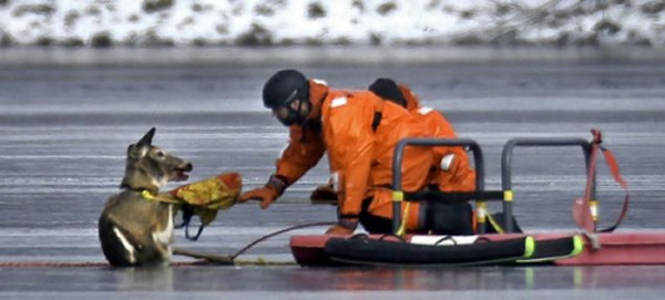 救援人员用滑板车将野鹿运送上岸。