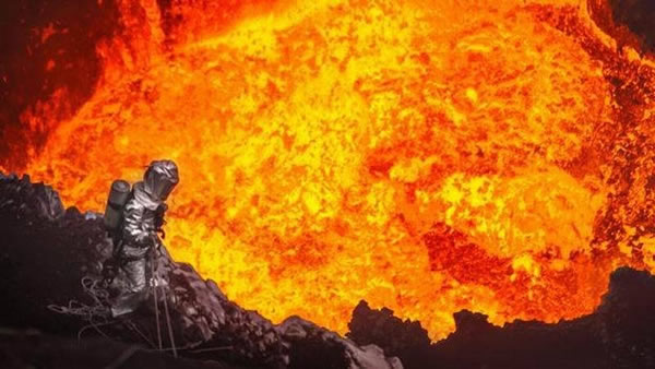 科学家杰夫-麦克利在瓦努阿图的马卢姆火山内做调查,他在距离沸腾的火山岩浆30米的地方呆了45分钟。