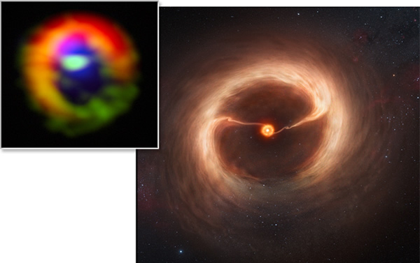 这些行星也仍然处于形成过程当中,每一颗都居住在它们自身的气体河流里,并被这些河流所掩盖。而这些气体河流来自它们所处的星系边缘的一个巨大、形状奇特的光环(右上图是艺术家描绘的印象图;插图是智利阿塔卡马毫米波大天线阵/亚毫米波阵列望远镜拍摄的图像)。这些行星的重力将气体从光环中吸引过来,但是,大部分气体越过了它们,反而通过一个巨大的空隙朝恒星撞去。近日,天文学家将相关研究成果在线发表在了《自然》杂志上。
