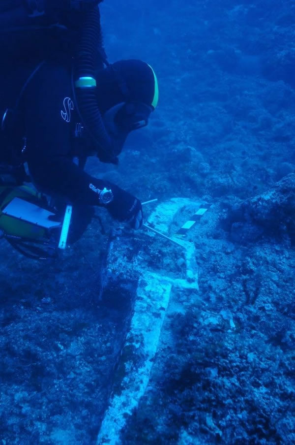 一位研究人员正在检查或许是安蒂基西拉岛沉船事故中沉没的船锚。