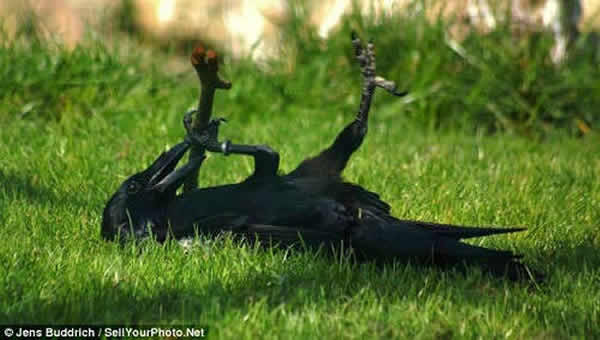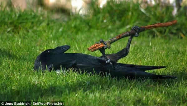 调皮渡鸦躺在地上玩木棍 来源: 神秘的地球 时间:2013年1月09日 12:14 调皮渡鸦躺在地上玩木棍 调皮渡鸦躺在地上玩木棍 德国一位业余摄影师日前在一家公园中拍摄到有趣的一幕。一只调皮的渡鸦竟然平躺在地上,双爪抓着一根木棍玩了起来。而且这个小家伙看上去非常乐在其中。 摄影师表示,渡鸦玩木棍的景象很不寻常。但鸟类专家称,渡鸦实际上是一种非常爱玩耍的鸟类。 专家称,渡鸦、乌鸦、喜鹊等鸦科鸟类都非常聪明,能够在玩耍的过程中学习技能。 当地自然保护区的一位负责人称,他就曾看到一只渡鸦平躺在地上,而其同伴则反复从其身上跃过,就像在玩“跳山羊”游戏一样。 中新网1月9日电 上一篇 下一篇 TAG: 渡鸦