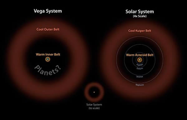 通过观测织女星和北落师门周围的离散带,高温和低温尘埃所发出的红外光,发现了两恒星周围新的小行星带。彗星与岩石块的碰撞,使得这一区域尘埃弥漫。其内侧带在可见光下无法看见,是因为其主恒星的光亮使之相形黯淡。