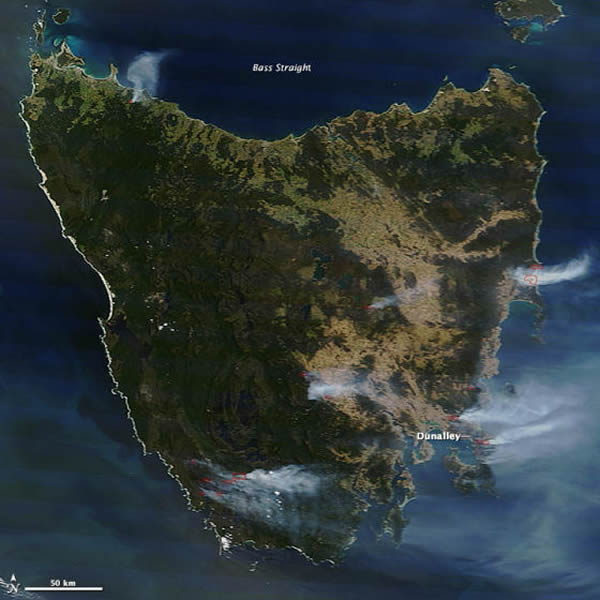 2013年1月6日,NASA的Terra卫星上的中分辨率成像光谱仪(MODIS)拍下了上面的第一幅照片,显示了塔斯马尼亚岛上燃起的多处大火。红色的轮廓线表示地表温度异常高的地方。