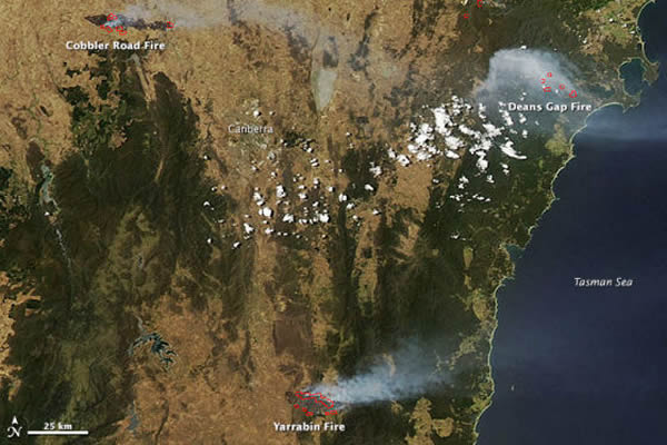 数百场无法控制的大火贯穿了澳大利亚人口最多的两个州——新南威尔士州和维多利亚州——。其中最猛烈的大火是的 Deans Gap大火,Yarrabin大火, Cobbler Road大火。 2012年1月9日,美国宇航局的Aqua卫星上的中分辨率成像光谱仪(MODIS)拍下了另一幅照片,显示了这三处大火。
