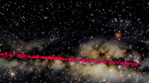 图中的红线标记了科学家新发现的银河系HII区,其横跨了银河系的部分区域
