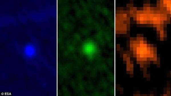 欧空局的赫歇尔空间望远镜拍摄了这几张小行星阿波菲斯的照片,时间是在2013年1月5日~6日,此时这颗小行星正近距离掠过地球。这张照片上所展示的是小行星阿波菲斯分别在70,100以及160微米上获取的影像