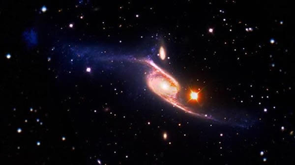 这张NGC 6872星系图像是结合欧洲南方天文台甚大望远镜可见光观测数据、GALEX探测器远紫外线观测数据和斯皮策望远镜红外线观测数据处理合成的