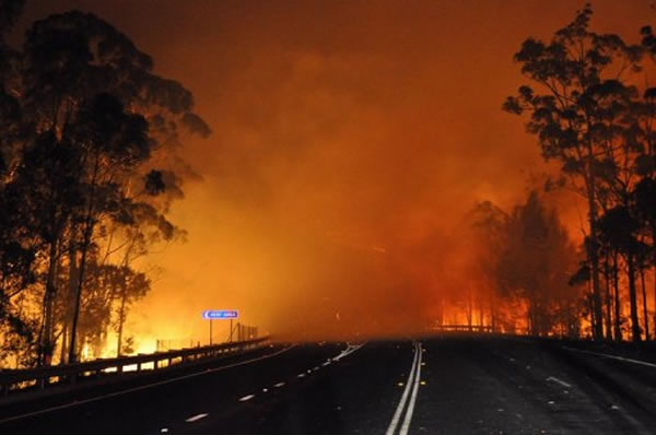在澳大利亚新南威尔士州,高速公路附近的树木起火,天空映着火光。