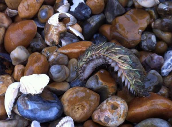 事实上这是海毛虫,一种通常在水面2200米以下的海底虫类生物,伴随着大风暴有时会被冲到岸上。眼光尖锐的朱莉-谢拉德看到长着彩色光亮厚毛发的生物位于海滩的鹅卵石和贝壳之中。