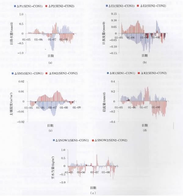 降水(a)、蒸发(b)、表层土壤湿度(c)、径流(d)和雪水当量(e)变化(敏感试验—控制试验,5天平滑)