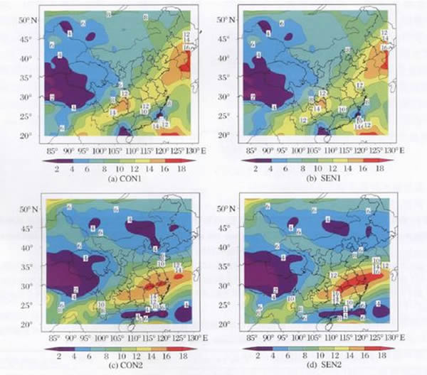 研究发现:陆面对水循环的影响受大尺度环流背景场影响较大,较弱的环流背景下再循环降水率较强环流背景大5%左右。土壤初始状况对水循环要素有一定程度的影响。土壤初始温度升高/降低,水汽通量增多/减少,后期降水增大/减小。不同环流背景下,土壤记忆时间不同,在弱的环流背景下,土壤记忆时间要长,初始状况扰动可持续1至2个月。