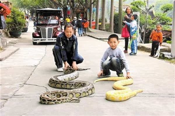 “遛蛇哥”带巨蟒晒太阳 来源: 神秘的地球 时间:2013年1月17日 10:23 “遛蛇哥”带巨蟒晒太阳 昨日,不少带着宠物出来晒太阳的游客在东莞市常平镇隐贤湖畔游玩时,看到两名“遛蛇者”带着两条大蟒蛇晒太阳。这让围观者惊讶不已。 据“遛蛇者”介绍,这两条蛇都是蟒蛇,其中黑色的是越南蟒,金黄色的是黄金蟒,都是他们的“家庭成员”。其中,越南蟒来到他们家时是在19年前,那时还是一个蛇蛋,如今已长到4米多,体重约100公斤。身形较小的黄金蟒也养育了近10年。多年来,这两只蟒蛇与他们一家人吃住在一起,还经常被带着出来散步、运动。 深圳商报 王海荣 上一篇 下一篇 TAG: 巨蟒