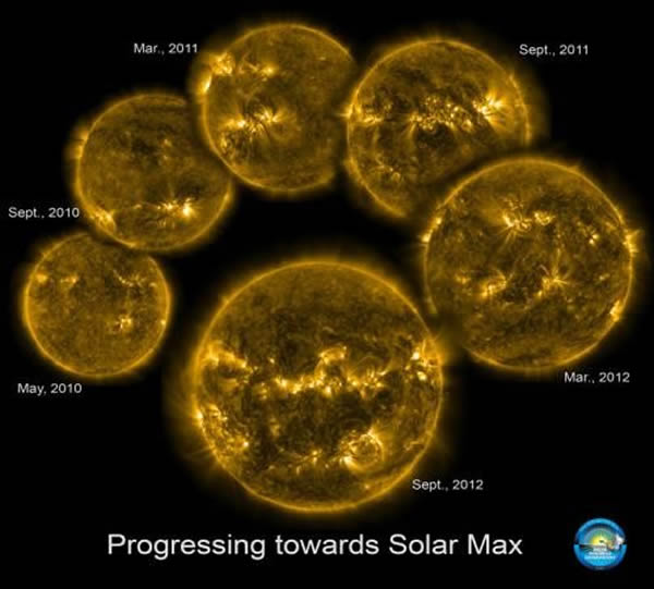 这六张图片是从太阳动力学观测站(SDO)选来的,代表着每六个月的太阳活动情况。太阳动力学观测站自从2010年5月份不断地拍摄图片以来,一直在跟踪太阳活动的上升水平,太阳活动高峰期可望在2013年到来。这些图片是在波长为171埃的极紫外光状态下拍摄的。