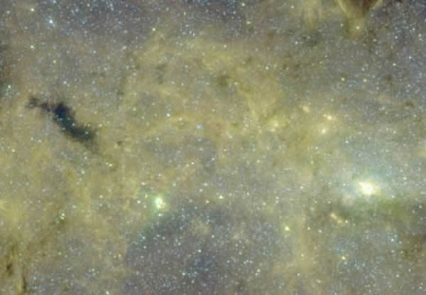 在这张照片中,美国宇航局的斯皮策空间望远镜拍摄了神秘的尘埃气体云团G0.253+0.016(即图像中左侧暗色区域)。图像右侧明亮区域为银河中心