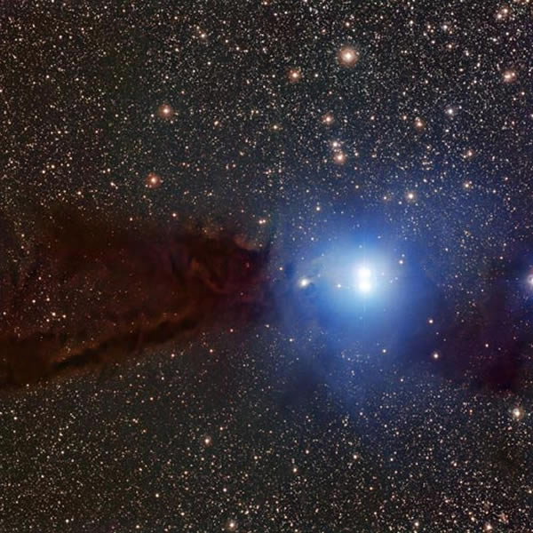 恒星形成区域的近照,在暗星云附近是一个明亮的星团。