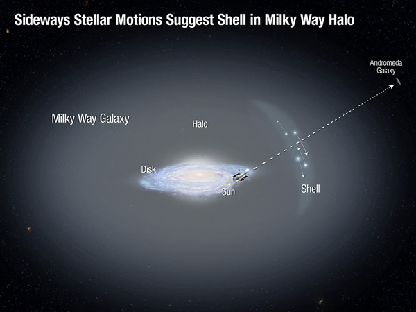 Such a signature may have been found recently in our own Milky Way halo using the Hubble Space Telescope. Though our Galaxy is a spiral type, with a large disk of stars and gas with a radius of 50,000 light years as its main feature, it also sports a large spherical halo of old stars and dark matter that extends many times beyond the spiral arms. Because the halo is so large, and halo stars so few and far between, getting an accurate measure of the motions of halo stars is a challenge.