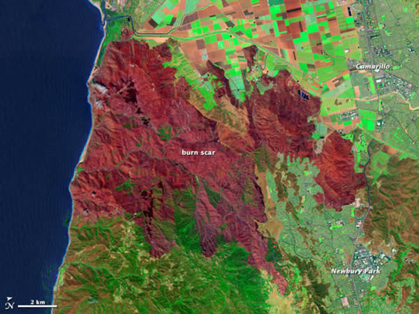 美国国家航空航天局地球观测站(NASA's Earth Observatory)今日公布了一组卫星照片,展示了美国加利福尼亚州南部野火火灾对植被严重摧毁。