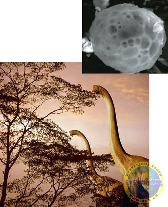 小行星撞击导致的石油大火令恐龙生存艰难。右上为新证据——碳球。(图片来源:Jim Zuckerman/CORBIS; (inset) Harvey et al., Geology, Geological Society of America (May 2008))