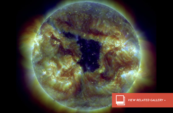 Snapped through three of NASA Solar Dynamics Observatory‘s (SDO) extreme ultraviolet filters, this coronal hole is caused by a low density region of hot plasma.