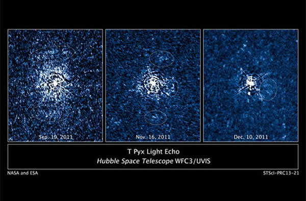 Hubble photographed an April 2011 explosion in the double-star system T Pyxidis (T Pyx for short), which goes off every 12 to 50 years. The new images reveal that material ejected by previous T Pyx outbursts did not escape into space, instead sticking around to form a debris disk about 1 light-year wide around the system.