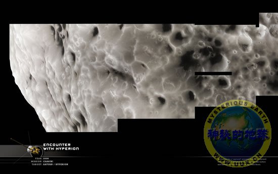 土星的卫星Hyperion是在一个翻腾的轨道中运行的一个形状不规则的天体,看起来有点奇怪:当“卡西尼”飞船于2005年9月掠过该天体时,发现它有一个独特的海绵质表面。“卡西尼”飞船所获得的初步结果。首先,成像和了射电数据表明,海绵外表是由一个多孔天体被碰撞造成的。因此,以前声称海绵质表面是由与冰川上所发生的因来自阳光的热量积聚而使冰川表面凹陷加深的类似过程造成的观点就站不住脚了。第二,近红外和紫外线光谱显示了覆盖该天体大部分表面的高反照区域的表面组成的细节,也显示了低反照区域(大部分在碰撞坑的底部)的表面组成的细节。所获光谱与存在被一种有机固体物质污染的水冰的猜测是一致的。低反照材料在光谱属性上与在土星的另外两个卫星(Iapetus 和 Phoebe)上所发现的物质类似,含有水冰、复合有机物、二氧化碳和腈的混合物。这种混合物与彗星中的物质、很可能也与柯伊伯带天体中的物质相似。