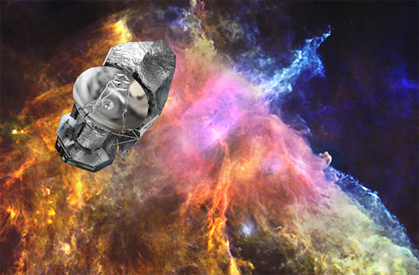 Artist's impression of the European Herschel infrared observatory against a backdrop of the Horsehead Nebula, as imaged by the mission.