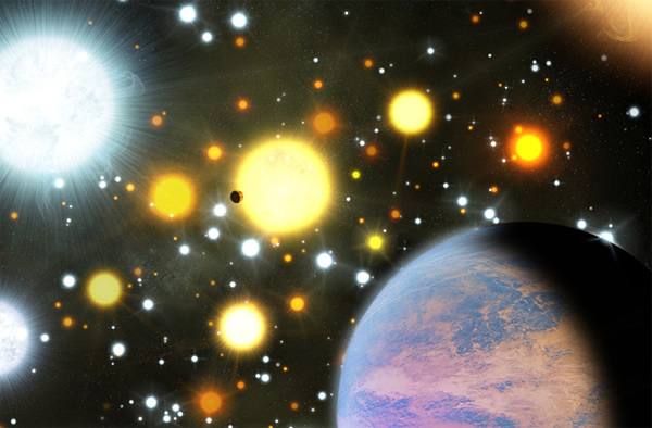 Artist's impression of exoplanets orbiting stars in a dense cluster.