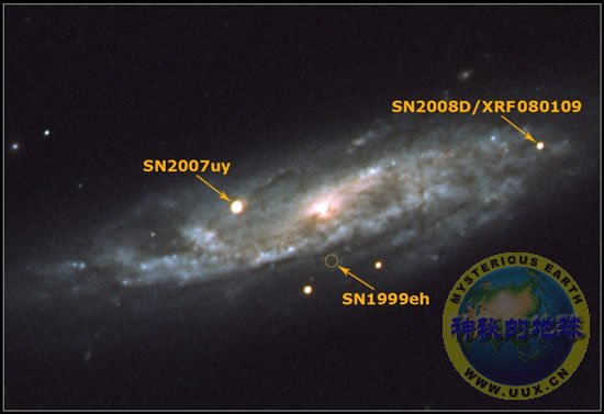 2008年1月9日。用Swift天文台的X-射线天文望远镜对星系NGC 2770进行的例行观测却幸运地获得了意外的发现。这次观测在该星系其中一个螺旋臂中探测到一个意外的瞬时X-射线暴,持续时间为3分40秒。进一步观测表明,这是第一次观测到一种新型Ibc超新星,它被称为SN2008D。以前,这种类型的超新星(由寿命短、但巨大的恒星壮观的爆炸所产生)主要是在实际事件发生之后几个小时以延迟的可见光形式发现的。但这次X-射线暴产生于爆炸之后不久,很可能是超新星激波从前体恒星“分离”出来。它的发现,使SN2008D成为迄今被研究最好的正常超新星。而且,这一发现对于今后的研究工作也有重要意义,因为宽场X-射线卫星观测每年应当能够发现接近爆炸时间的数百个新的超新星。