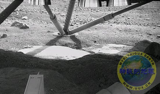 这张由凤凰号机械臂上的相机拍摄的照片,展示了凤凰号着陆器底部的地面情况,图像显示出一块白色光滑物,有可能是一片冰床。由于着陆过程中凤凰号底部着陆火箭的作用,吹散了原先覆盖在这片冰床上的一层薄沙粒,才使其露出地面。