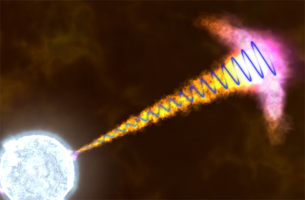 An artist's illustration of how theoretical models link the presence of strong, stable polarized light in a gamma-ray burst's jet with a large-scale magnetic field (a blue spiral) originating from the newly formed black hole.