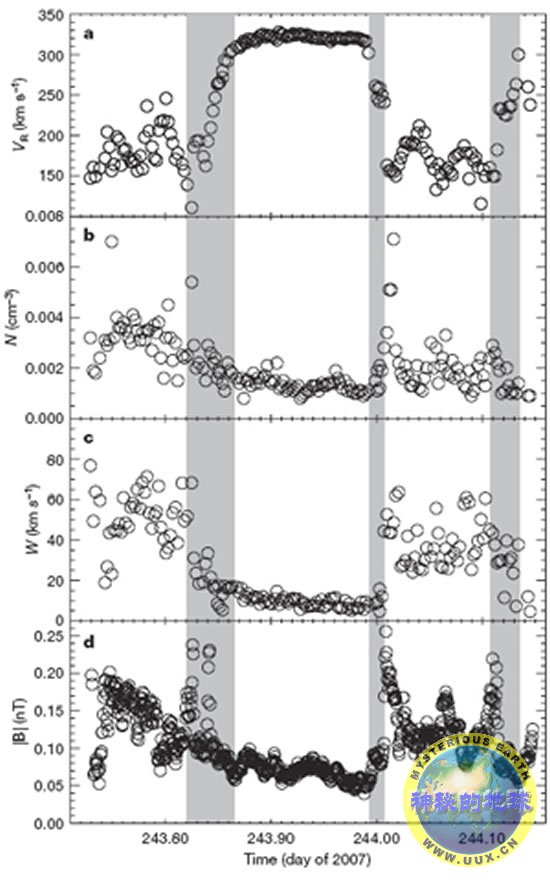 由于太阳风动压的变化和波动的影响,终止激波并不是静止不动的,而是沿径向来回运动,造成多次跨越“旅行者二号”飞船。通过对探测数据的详细分析,得到了新的重要发现:(1)一般而言,激波会将超声速(马赫数大于1)的流体变为亚声速(马赫数小于1),而终止激波的下游仍然是超声速流动;(2)下游等离子体的温度比理论预期值低10倍以上。之所以产生与我们熟悉的激波特性的不一致的主要原因是由于星际介质中存在着大量的中性成分。这些中性成分(主要是中性氢原子)与电离的太阳风质子通过电荷交换产生新生离子(Pickup Ions)。太阳风动能减少产生的能量大部分供给了新生粒子,只有少部分能量用来加热太阳风等离子体,从而造成终止激波下游太阳风等离子体的温度比预期值偏低,从而声速变小,导致终止激波的下游马赫数仍然大于1。随着“旅行者二号”飞船继续在日球鞘区内探索,越来越多的太阳系边缘的自然奥秘将被人类揭示。