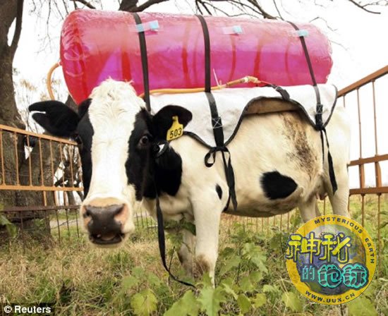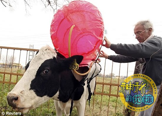 研究人员称,由于牛的消化系统运作缓慢,使它们常常能释放出一种甲烷气体,而这种气体与二氧化碳一样,也是导致全球暖化的因素之一,不过这一点很少被人知道。正当全世界的科学家都在研究如何搜集牛释放出的甲烷时,阿根廷科研人员想出这一特别的办法来搜集这种气体并进行研究分析。他们在牛的后背装上一个红色的塑料箱,将其与一根插入牛胃部的管子相连,这样就可以搜集到牛打嗝儿和放屁排放出的气体。