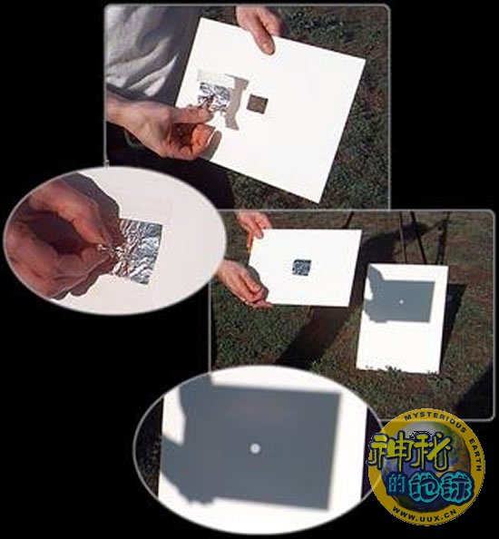 其实,简易的做法仅仅使用两张白纸即可。一张白色纸板用作银幕,另一张纸板上戳有一个针孔。将针孔纸板举起,尽量远离银幕纸板。两纸板距离越远,形成的图像会越大。当然,还有更为简易的方式,只需要自己的双手帮忙。将双手举起,手指相互垂直、交叉重叠。于是,双手形成了一个带有许多小孔的网,这些小孔可以作为简易的成像孔。
