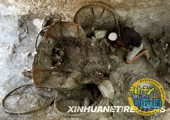 保加利亚发现公元二世纪的古代战车 来源: 神秘的地球 时间:2008年8月08日 11:20 保加利亚发现公元二世纪的古代战车 8月7日,在保加利亚首都索非亚以东360公里处,挖掘出的古战车上的装饰物被展现出来。近日,保加利亚在该地区发现了一辆完整的公元二世纪的古战车。 新华社/路透 8月7日,在保加利亚首都索非亚以东360公里处,一名考古工作者在挖掘现场清理古战车。新华社/路透 8月7日,在保加利亚首都索非亚以东360公里处,一名考古工作者站在正挖掘的古战车旁。新华社/路透 上一篇 下一篇 TAG: 保加利亚 战车