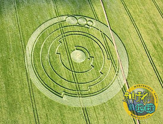 这个麦田怪圈位于威尔特郡百布里城堡附近,直径约为46米。已退休的天文学家迈克尔•里德对这个麦田怪圈进行仔细研究后发现,这个由10个不同半径的部分圆圈所组成的图形与复杂的圆周率有着密切的关系。截取每段圆圈的十分之一进行测量后,顺序排下来,并以靠近圆心的小点为小数点,其数字为3.141592654,这恰恰是圆周率的前十位数字。里德认为这样的结果简直不可思议。对于里德的发现,英国著名麦田怪圈专家露西•普林哥认为,这是麦田怪圈研究的重大突破。