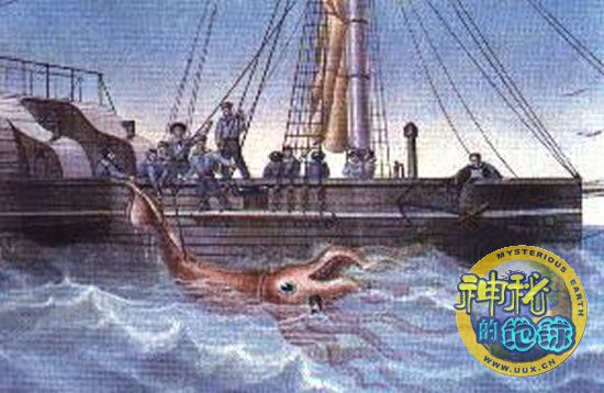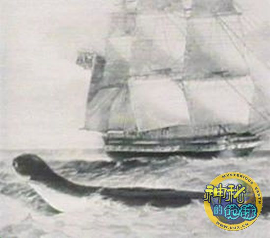 1966年,美国人布莱特和里奇埃为创造新纪录,决定划小船横渡大西洋。7月的一天晚上,忽然有绿色和磷光忽闪忽灭,里奇埃惊慌地抓住布莱特的肩膀,布莱特沿他手指方向望去也吓呆了:原来水里伸出一条长颈,颈上有个“牛头”,但没有角和耳朵,它鼓着双眼,射出咄咄逼人的绿光,冷冷地看着他俩,他们几乎吓晕过去了。