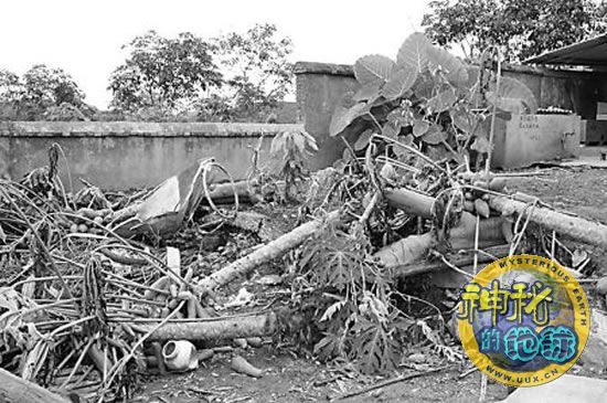 当记者来到林业管护瞭望塔时,发现围墙四周布满了大象脚印,正面的大铁门已经被野象毁坏,左侧面的水管也被折断。院内的木瓜树、电视节目接收器、门窗、锅碗瓢盆等全部被大象踩扁,路边的一根水泥电杆也被一头秀“铁头功”的大象撞断。