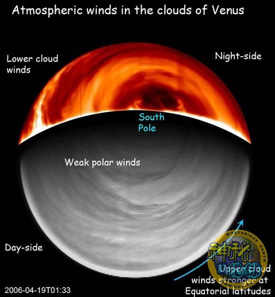 通过金星快车号探测器上搭载的成像光谱仪(VIRTIS),结合金星表面的风向和云层结构图,奥古斯丁教授发现了“超级旋转”现象几个新的特点:首先,在赤道到中纬度地区,金星上的风向是自东到西的,速度也从每小时370公里下降到180公里。从中纬度到极点地区,风速逐渐减小到0,然后在极点地区形成一个巨大的漩涡。其次,在金星南部地区,云层活动是非常弱的,风速也只有每小时15公里。此外,他们还首次发现“太阳热能潮汐”(the solar thermal tide)现象也会对金星云层活动产生影响。“超级旋转”现象在太阳升起的时候要比太阳落下的时候更剧烈。