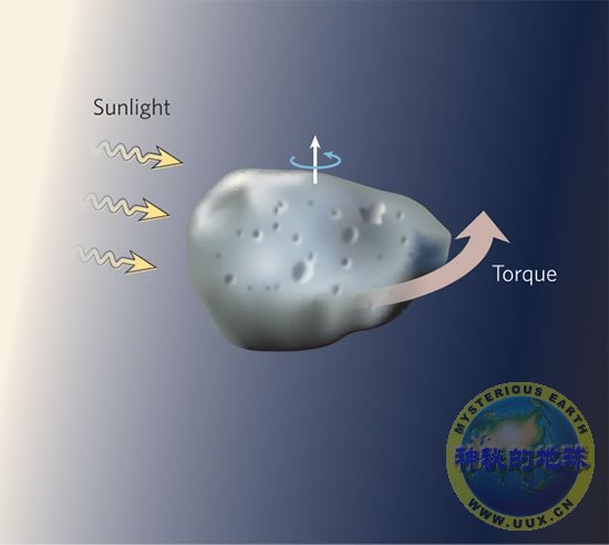 YORP(Yarkovsky-O’Keefe-Radzievskii-Paddack)效应是太阳系中的一个重要影响因素。实际上观测它的作用过程是非常困难的,但是现在,对小行星1862 Apollo科学家已经做到了这一点。当太阳能从一个非对称天体被发射并重新辐射时,YORP效应出现。所产生的力起一个引擎的作用,驱动该天体转动。这一同样的非对称性还可被用来跟踪一个小行星的转动,因为它在不同时间反射不同数量的光。重新分析关于小行星1862 Apollo自旋的记录,研究人员发现,由于YORP效应,它的转动速度在仅仅40年时间里就已经增加了额外一圈,在效果上相当于增加了一天,即便Apollo的直径远远大于一公里。