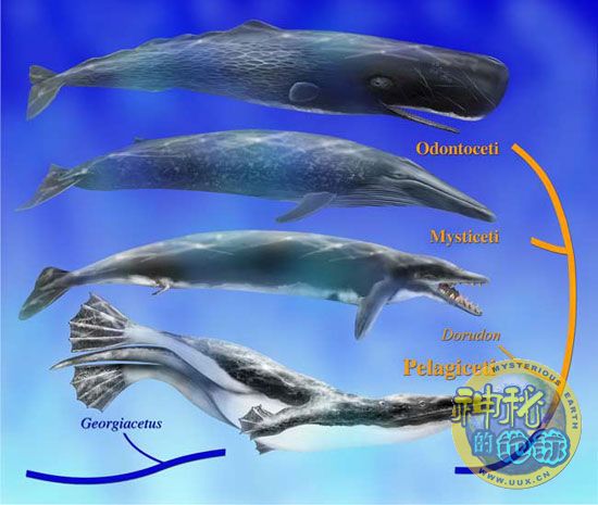 在生物的进化史上,从古代的陆上四足动物到现今的水中哺乳动物,一直缺少了一环。因此,学者们认为,上述发现的古鲸化石恰恰填补了这一空缺。然而,古鲸为什么要从陆上迁到水中呢?原来,古鲸生殖及哺育后代的活动都是在陆地上进行的,就如现在的海狮、海狗、海豹等两栖动物一样。但是,生物的进化往往受环境变化的影响,大约在5000万年以前,由于水中的食物和掠食者的比例相对于陆地环境更易于古鲸生存,它们便开始进入水里;大约在距今1000万年时,古鲸的后代进化得与现代鲸非常相似,它们长着尾巴和短短的脖子,后足也退化为鳍状的附属物,从此它们就不再上岸来了。